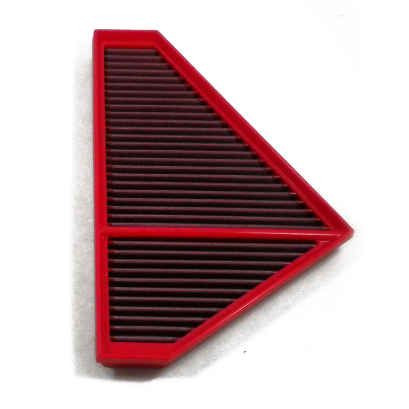BMCの吸入面素材にはF-1、ルマン24時間で使用されているものと同等素材が用いられ、レースで培われたテクノロジーが確実にフィードバックされています。極めて粘度の低い特殊ミネラルオイルに浸した高密度コットンガーゼの4層構造で、エンジン性能を守る世界最高レベルの防塵力と空気ろ過性、フィルター面通過時に生じる空気の圧力損失を最小限に抑え、高い吸入性能を両立させています。また、エポキシコーティングされた軽量アルミメッシュを採用し安定した吸入性能と耐久性を向上させています。一般的な使用状況で20,000kmのメンテナンス・インターバルで新品時の性能が維持できるのもBMCの特徴となります。